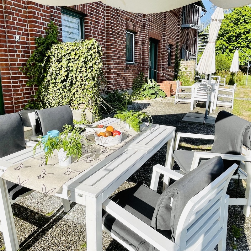 Die Wohnung befindet sich im alten Gutshaus auf der Rückseite mit Westausrichtung und eignem Eingang mit großer Terrasse mit Blick in den Garten. es gibt keinen besseren Platz für den perfekten Sonnenuntergang.